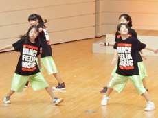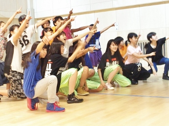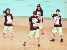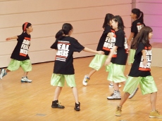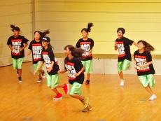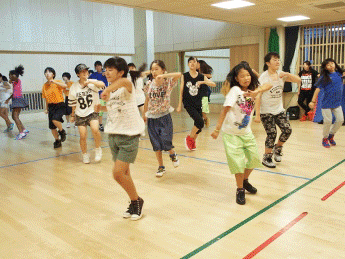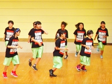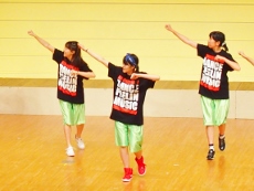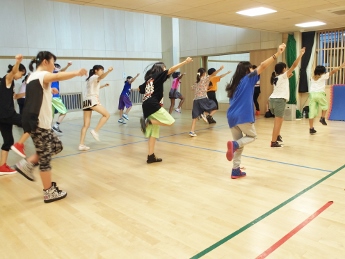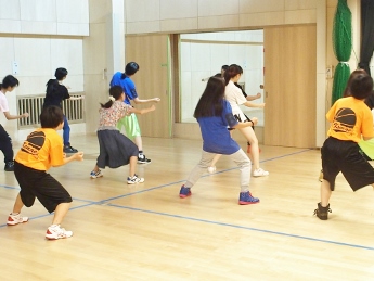 8月6日(土)、ことし建て替えられた和泉児童館にお邪魔して、ホールで練習している Team★D(チ-ムD) を見学させていただきました。ホールにはこのダンスのために(?)大型の鏡が取り付けられ、自分の動作を確認できるようになっています。すでに基本動作はでき上がっているようで、全体のチームとしての動作に重点が置かれた練習でした。先生の説明を受けている間は真面目ですが、思い思いの格好で…。ひとたび音楽な鳴り出したら、動きは機敏そのもの!!